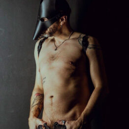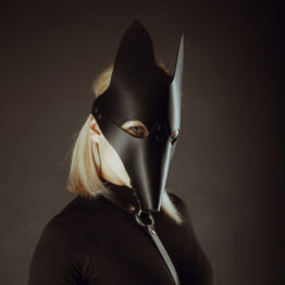 Шкіряна деприваційна БДСМ маска на очі з котячими вушками. Використовується зазвичай для деприваційних ігор (обмеження одного з органів сприйняття), що сприяє загостренню відчуттів під час сексу або БДСМ сессії. Маска має м’яку замшеву підкладку червоного кольору.