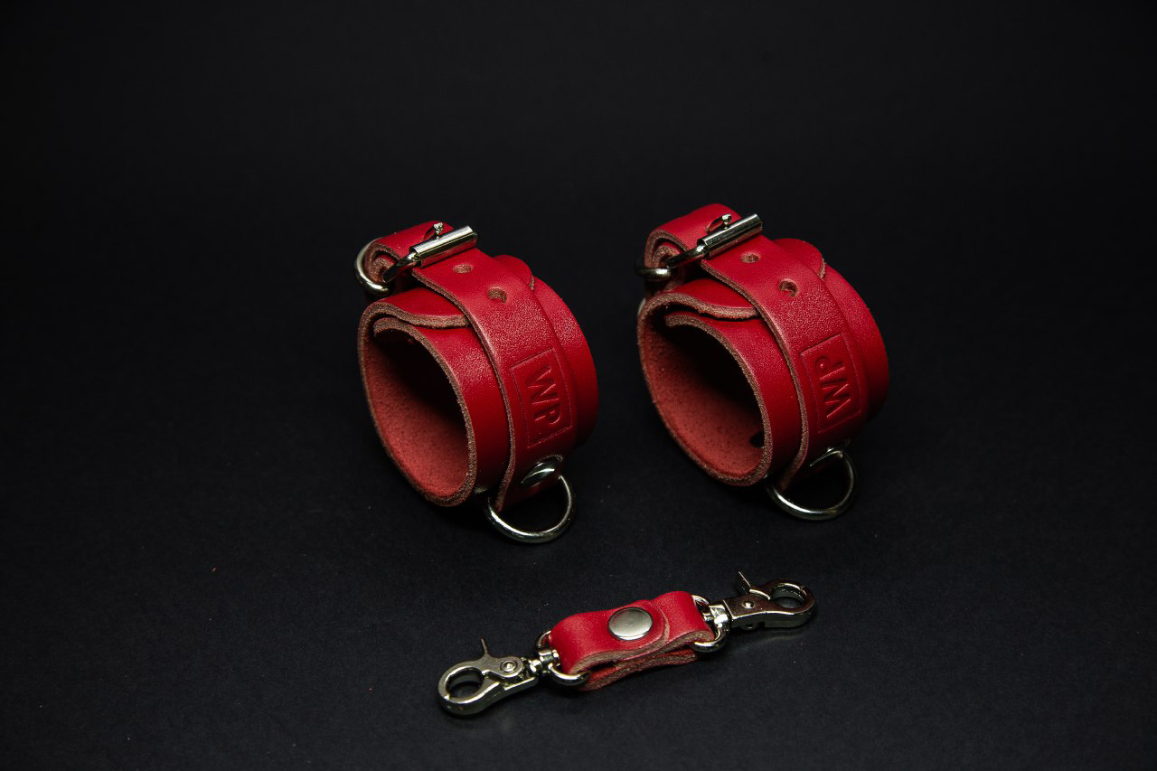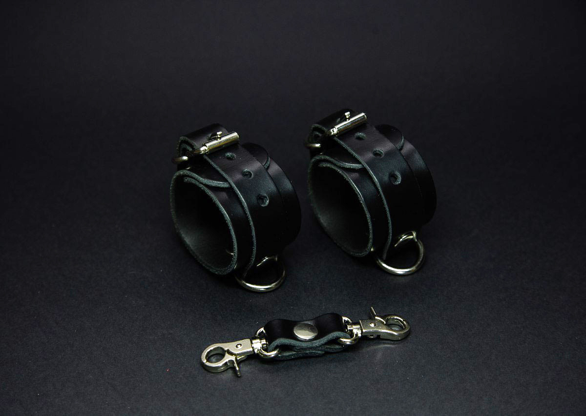 Шкіряні наручники ручної роботи від бренду Wolfsnaht комплектуються спеціальним ремінцем з карабінами для фіксації.